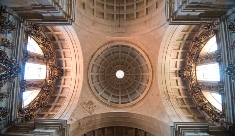 In the transept, the dome lit by a roof lantern and decorated with the emblem of the Society of Jesus stands out.