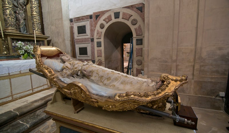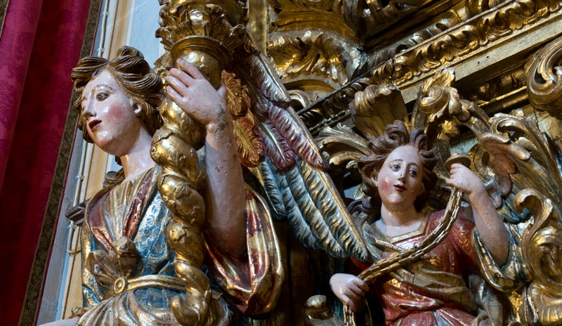 Flanking the central recesses of both altars are two major panels of reliquaries currently empty. The set is completed by torchbearer angels and cherubs profusely decorated.