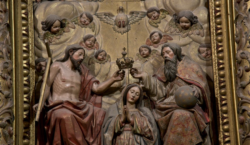 The altarpiece of the Chapel of the Life of the Virgin includes a sculptural group representing The Coronation by the Most Holy Trinity, framed by scenes of the life of Our Lady. On the niches, the Annunciation and the Visitation on the right side, and The Holy Family and the Assumption on the left side; the predella exhibits the Birth, the Presentation and the Bethrotal of Mary. In the upper section, there stands a sculpture of the Immaculate Conception; underneath there are painted symbols of the Marian litany.